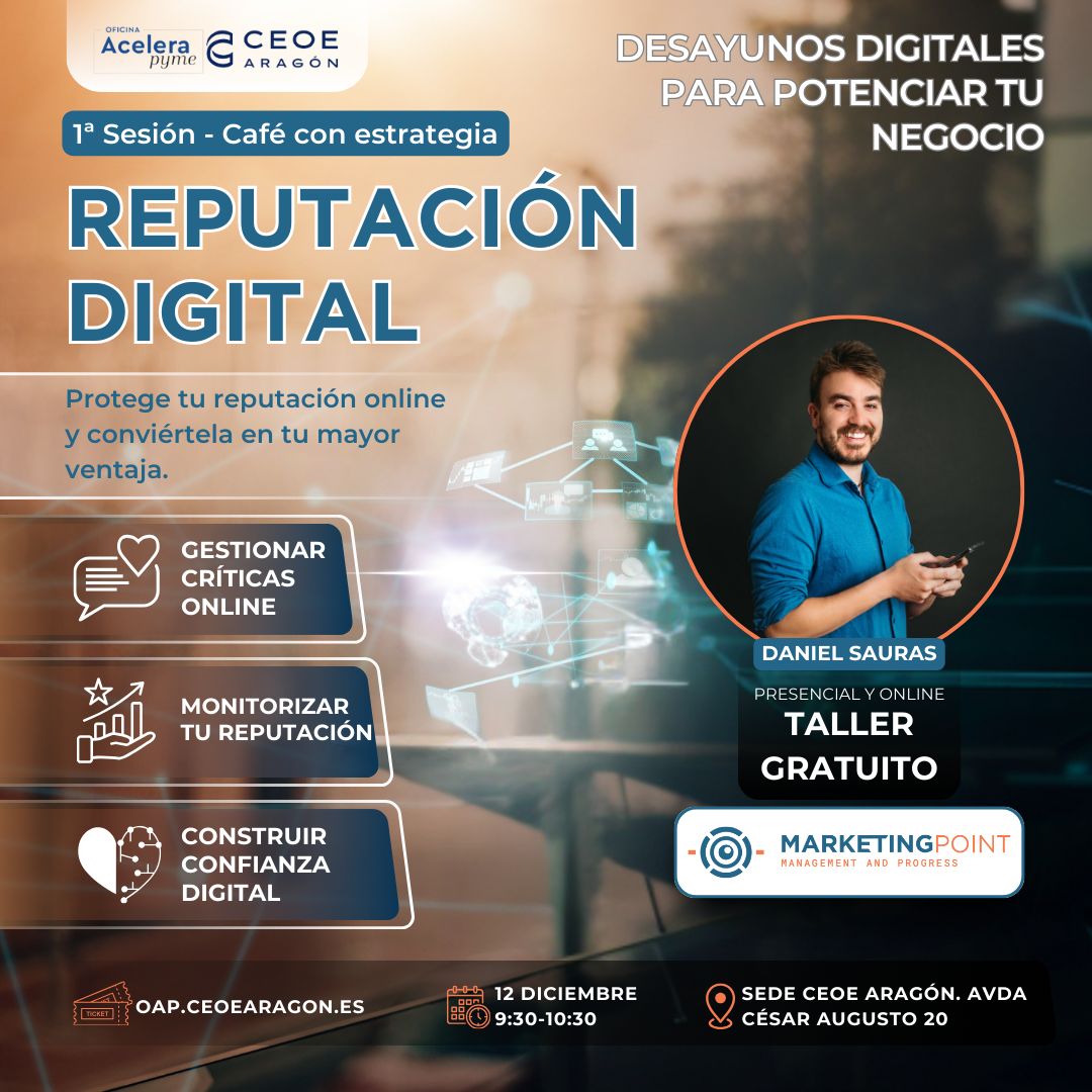Reputación digital: Cómo proteger y potenciar la imagen de tu empresa" Fecha: 12 de diciembre, 9.30. Híbrida: presencial y online Duración: 1 hora Descripción: En un mundo donde el 90% de los consumidores investiga online antes de tomar decisiones de compra, la reputación digital se ha convertido en un activo clave para cualquier empresa. Esta charla te […]