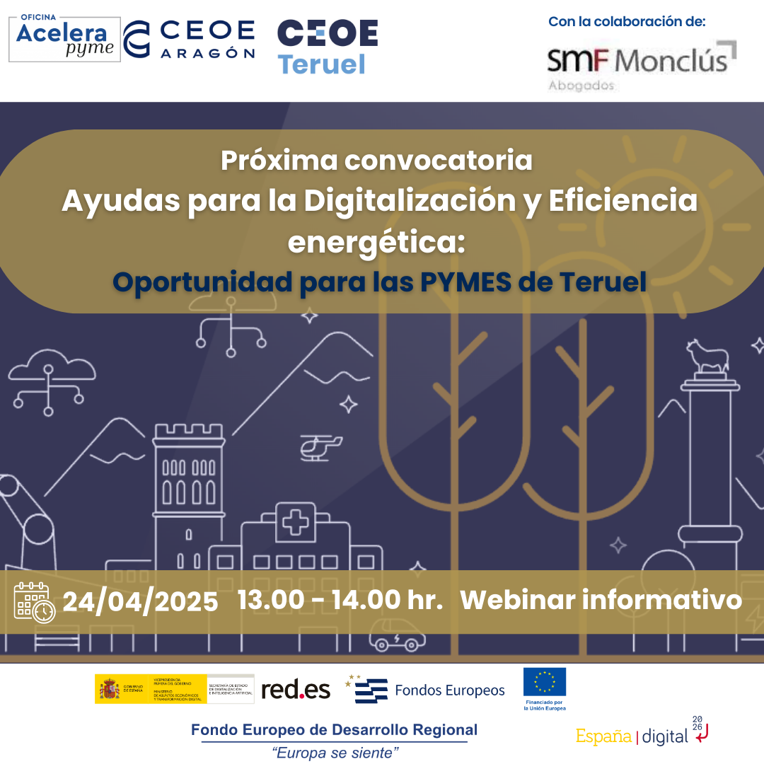 ¡Nuevas ayudas para la digitalización y eficiencia energética de tu PYME! El Fondo de Transición Justa (FTJ) lanza la segunda convocatoria de ayudas para apoyar a las pequeñas y medianas empresas de la provincia de Teruel en su transformación digital y mejora energética. 📅 24/04/2025 ⏰ 13.00 - 14.00 📍 Online En este webinar, te explicaremos: ✅ Quién puede solicitar estas […]