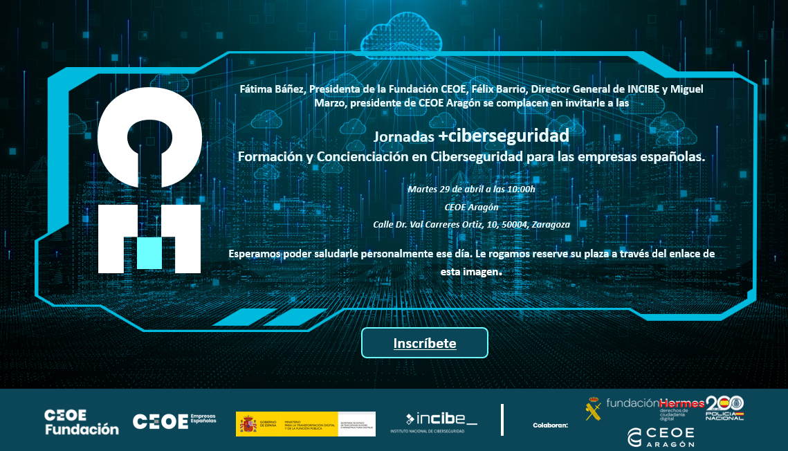 📅 29/04/2025 ⏰ 10.00 | 14.00 📍 Online / Presencial Programa: 10:00h APERTURA INSTITUCIONAL • Miguel Marzo, presidente de CEOE Aragón • Félix Barrio, director general del INCIBE • Fátima Báñez, presidenta de Fundación CEOE • Octavio López, consejero de Fomento, Vivienda, Movilidad y Logística del Gobierno de Aragón 10:30h VÍDEO EXPLICATIVO DEL PROYECTO 10:35h ESPACIO +CIBERSEGURIDAD. OBJETIVOS, […]